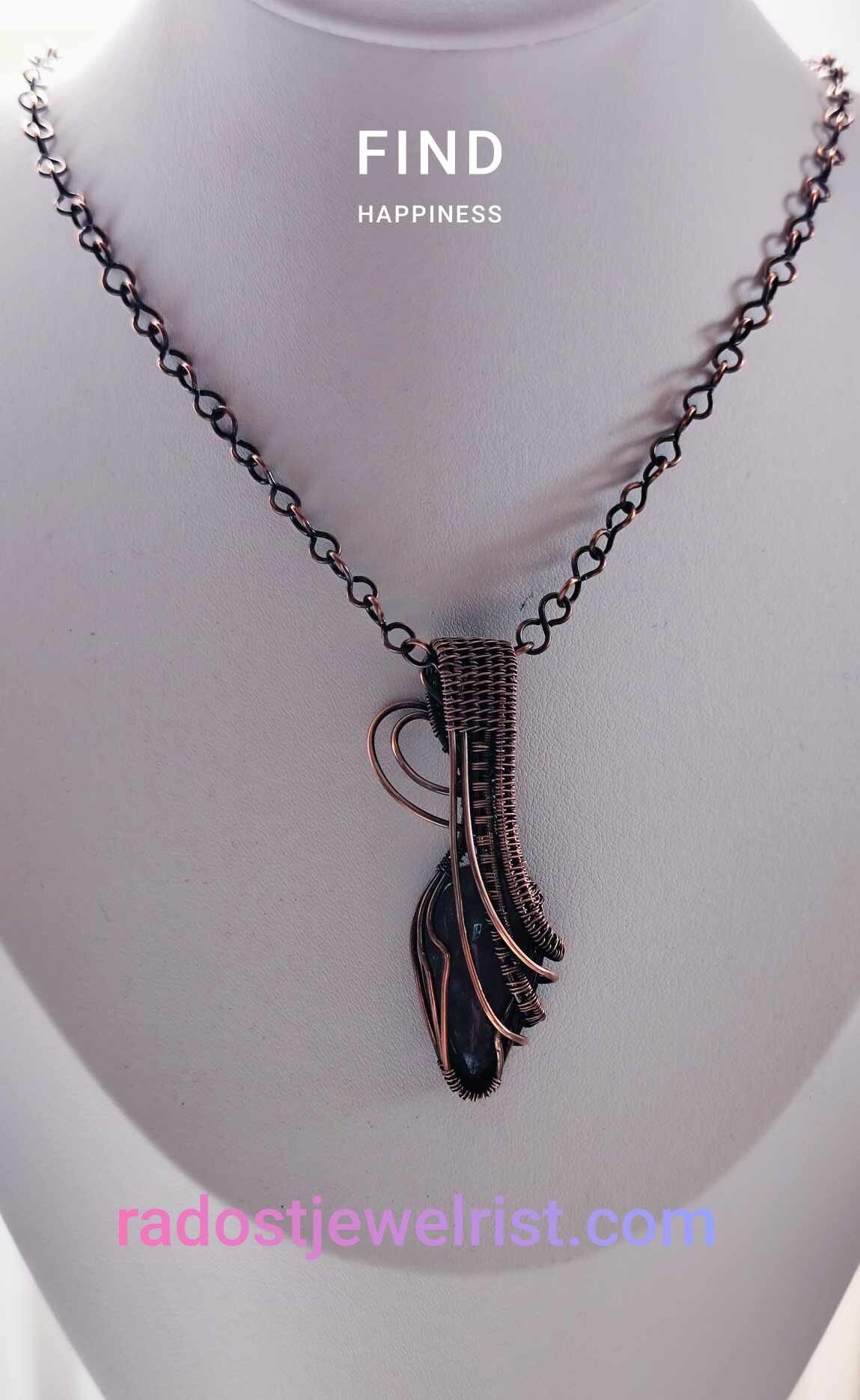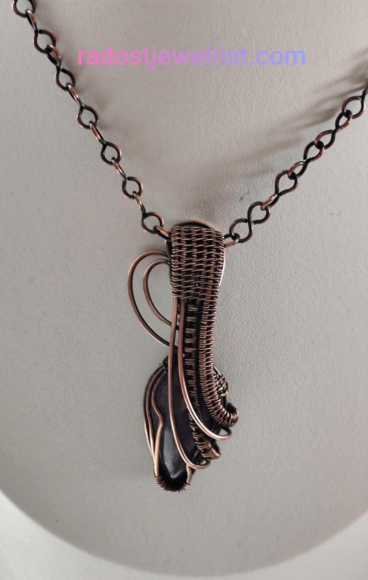 New women's necklace with an elegant pendant, handmade from copper wire and amethyst stone. The chain is also handmade and is included in the price of the necklace. This jewelry will be a unique companion in your everyday life, it sits very gently on the neck and gives a sense of style. It can also be an original gift for a beloved woman, friend, mother, etc.