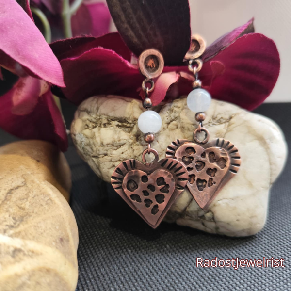 Discover the magic of handcrafting with these exquisite copper heart-shaped earrings! Each pair is created with attention to detail – cut, forged, soldered and oxidized by hand to acquire its characteristic, authentic look. The final polishing gives the metal a warm shine that beautifully contrasts with the natural stones woven into the design.