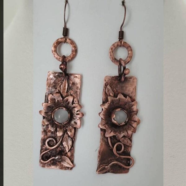 Handmade Copper Flower Earrings – Selenite Stone, Oxidized Jewelry