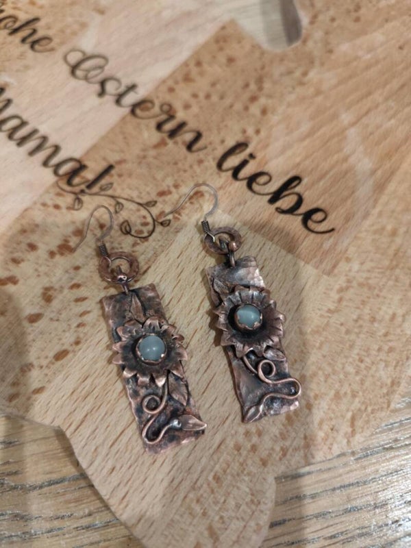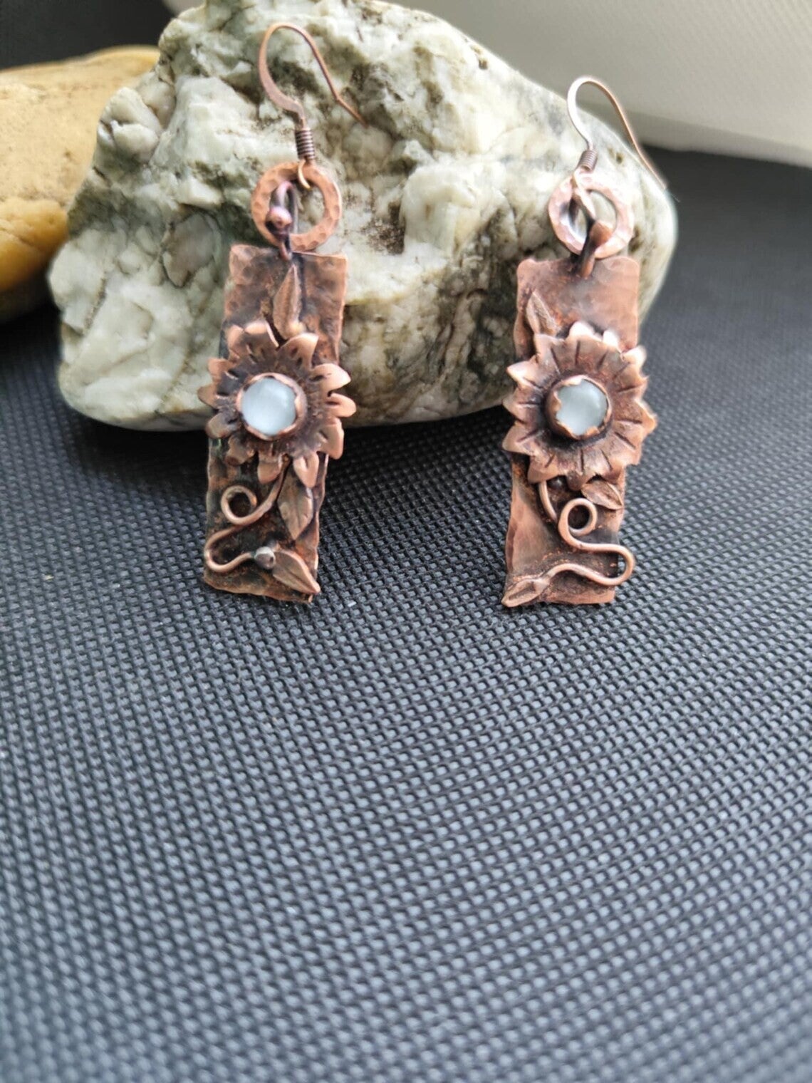 Handmade copper earrings with flowers and natural stones – selenite, a unique piece of jewelry with a soul